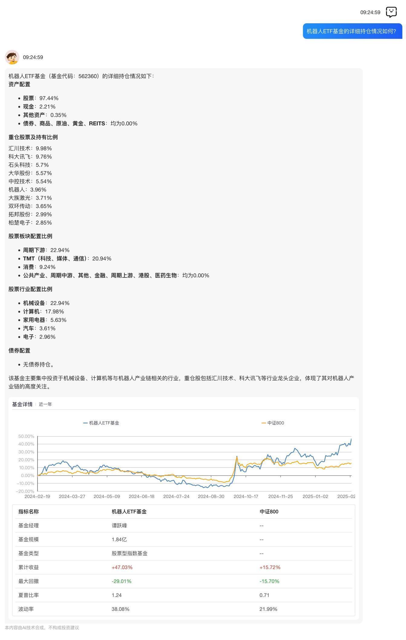 “基金通”可以像专业投顾人员一样智能识别用户问题,合理调用必要的分析工具、链接最新市场数据,完成基金/经理信息查询、对比分析、基金筛选、组合回测、组合诊断等复杂任务,辅助一线投顾人员提升专业服务能力。通过对接丰富的基金投研模型,“基金通”可以用自然语言回答用户超高自由度的问题,包括最新的基金、基金经理、基金公司各类信息的比较、分析和总结等场景。不仅可以对基金信息进行加工和输出,还可以实现基金多指标条件筛选、基金组合构建、基金组合诊断等复杂和专业的操作。