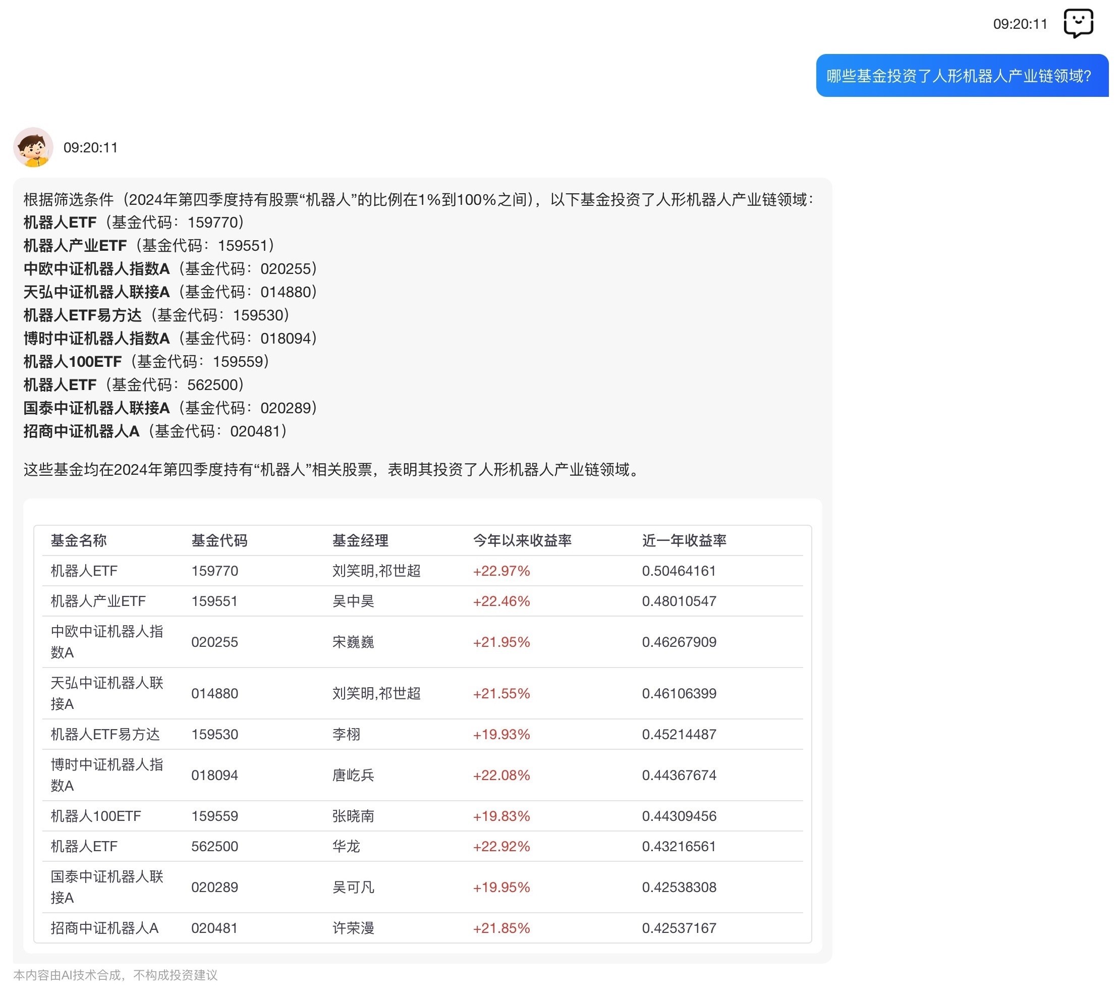 2月20日,有用户使用“基金通”专业版提问:哪些基金投资了人形机器人产业链领域?