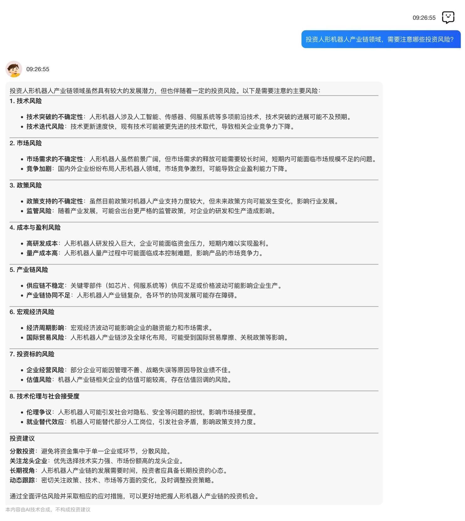 最后,用户想了解投资人形机器人产业链领域需要注意哪些投资风险。“基金通”专业版建议投资者综合考虑政策、市场、技术等多方面的风险,做好风险管理,关注龙头企业,分散投资,深入研究以长期视角做出谨慎的投资决策。